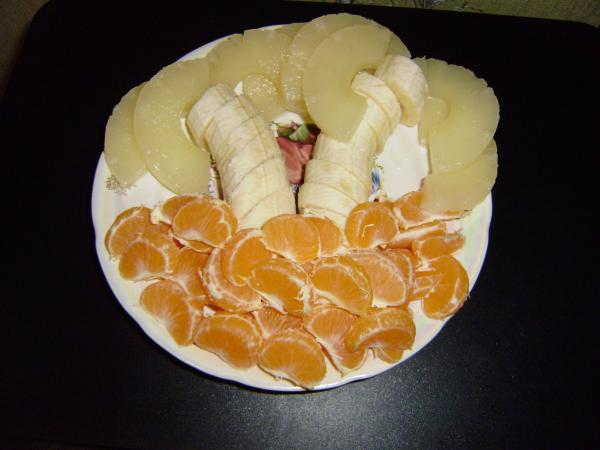 (попробуйте таким образом уложить дольки мандарина, бананы и ананасы на блюдо и у вас получится вот такой красивый остров с пальмами)