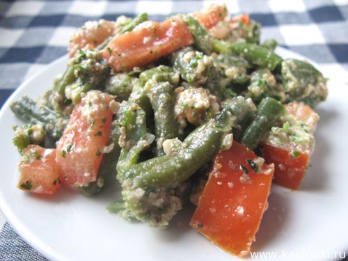 Ингредиенты: 600-700 гр. зеленой фасоли; 3 помидора; 6 зубчиков чеснока; 100 гр. грецких орехов; 50 гр. кинзы; подсолнечное масло; соль; перец.