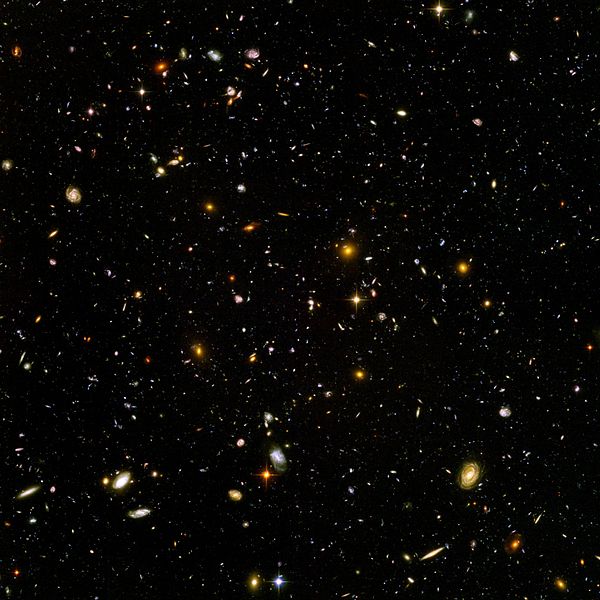На изображении, полученном по программе Hubble Ultra Deep Field, видны сотни галактик, самые красные и тусклые образовались всего через 800 млн лет после Большого взрыва.