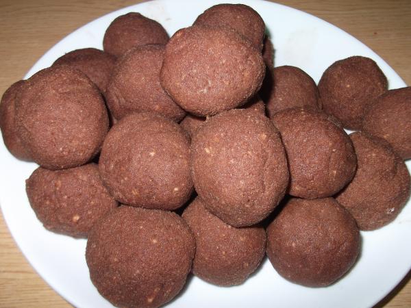 Готовое печенье, надо остывшим взвесить, нам потребуется 500 грамм. Его и оставляем на сутки, чтобы оно зачерствело. Нам надо будет потом раскрошить его как можно мельче, почти в порошок. Лучше всего это делать в глубокой миске. В раскрошенное печенье добавляем 50 грамм какао, 1 банку сгущеного молока(не вареного), 100 грамм сливок, но сливки лучше добавлять по чуть-чуть, все могут не понадобиться, хотя если масса будет слишком тугая, можно добавить еще сливок. Всё это надо хорошо вымесить. Это похоже на пирожное Картошка. Теперь надо разделить на четное колличество кусочков, и одинакового размера. Я брала по 50 грамм. Потом скатываем в шарики, вот такие: