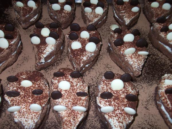 Теперь осталось самое малое - это немного украсить. Притрушиваем Ёжиков какао, только не много, так, слегка... Потом можно вставить шоколадные монетки двух цветов, или просто миндальные пластинки, типа колючки :) Еще, самое главное, это сделать им глазки и носик. Для этого подойдёт свежемороженная смородина, чёрная. Только вот у меня тогда под рукой не оказалось, и получились вот такие Ёжики: