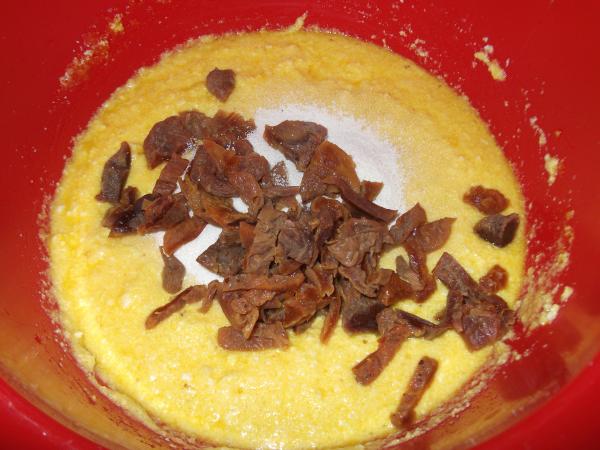 К сожалению, изюма в этот раз не оказалось, я его весь перед этим в торт использовала, пришлось заменить его курагой, и от этого запеканка во вкусе не очень-то и изменилась:)