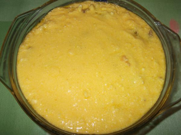 Нам надо перемешать все компоненты, (курагу я порезала тонкой соломкой) и влить тесто, в смазанную растительным маслом и присыпанную на дне манкой форму. Так запеканка легче будет выниматься. У меня форма была из огнеупорного стекла, и я горячей запеканку не вынимала, а подождала пока остынет.
