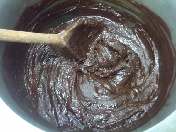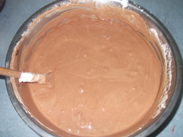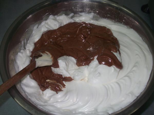 Когда шоколадная масса остынет, надо ввести в неё сначала желтки, аккуратно перемешать, затем, ввести белки и тоже аккуратно перемешать.