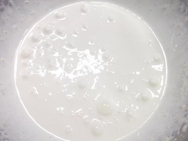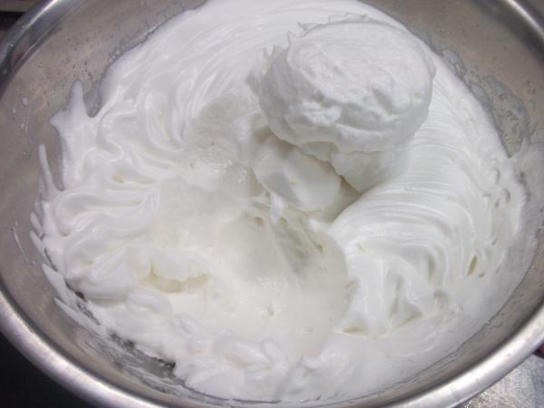 Теперь берем 4 белка + 4 ст. ложки сахара, взбиваем до полного растворения сахара и пышной пены. Чтобы сахар быстрее растворился, миску можно поставить на водяную баню, на одну минутку, при этом взбивая белки, потом снять и продолжить взбивать. Времени на это уйдет минут пять.