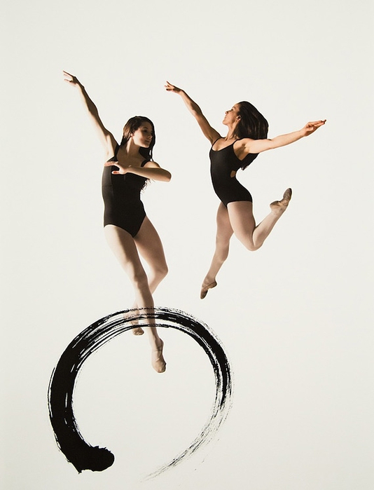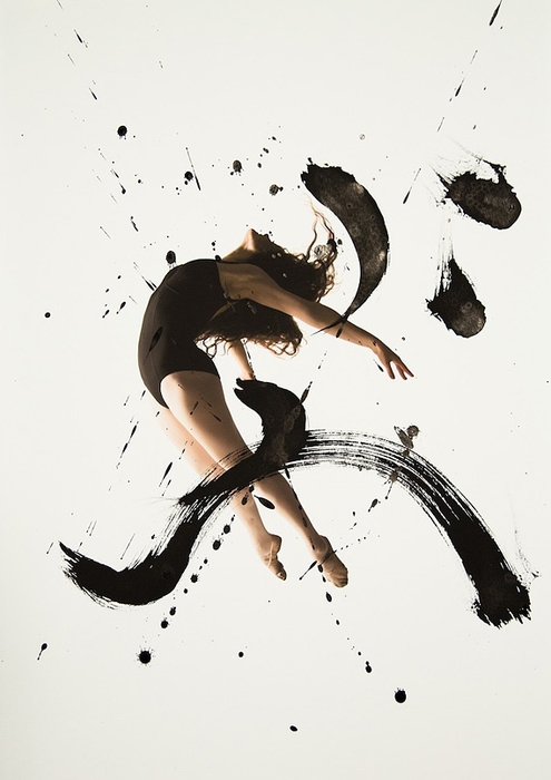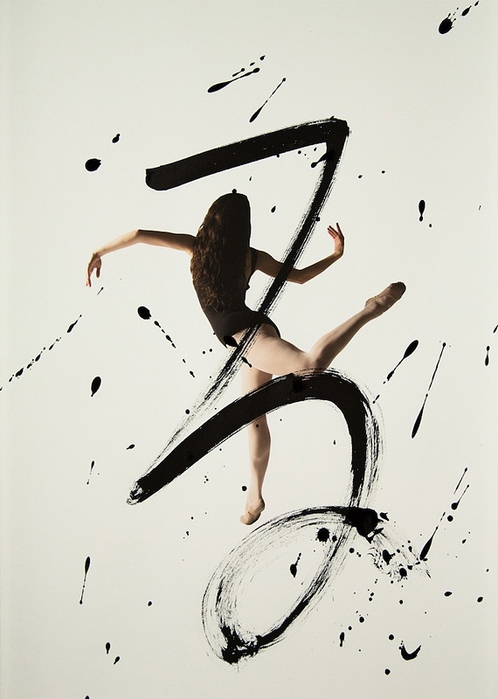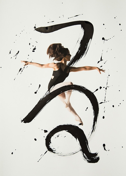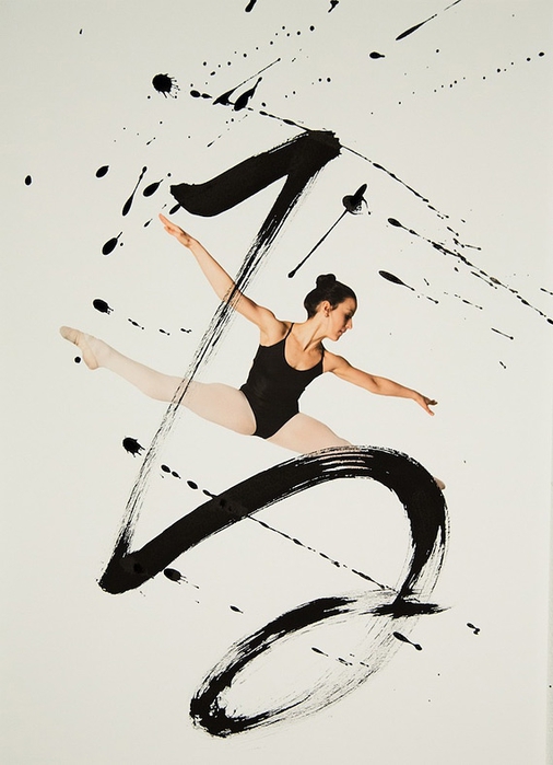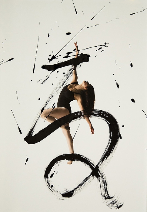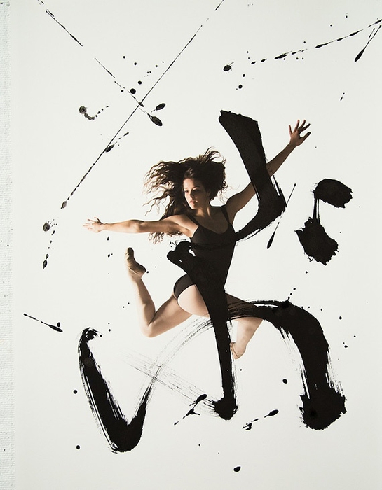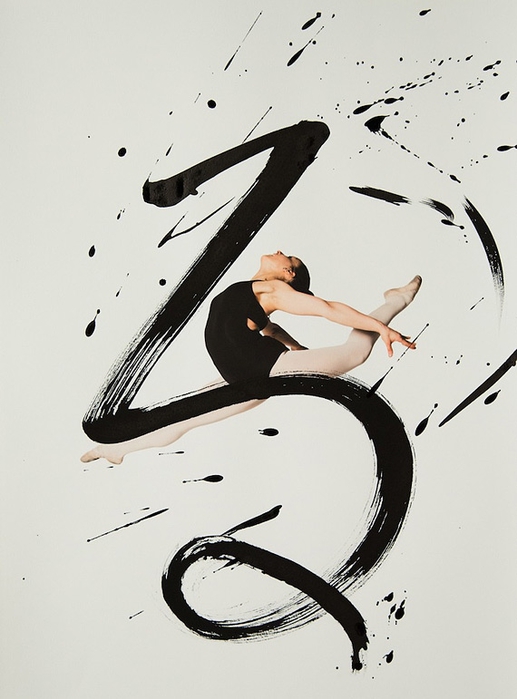 Помогали в этом артисты классического танца - Меган Сильва и Кэтлин Легассик. Они исполняли танцевальные па, фотограф фиксировала все их движения камерой. И последние штрихи сделаны калиграфом - графические символы - иероглифы были нанесены на акварельную бумагу, на которых отпечатаны снимки танцоров.