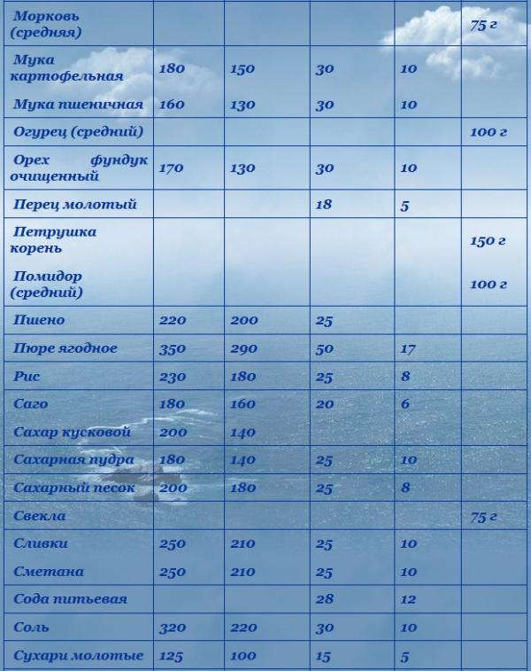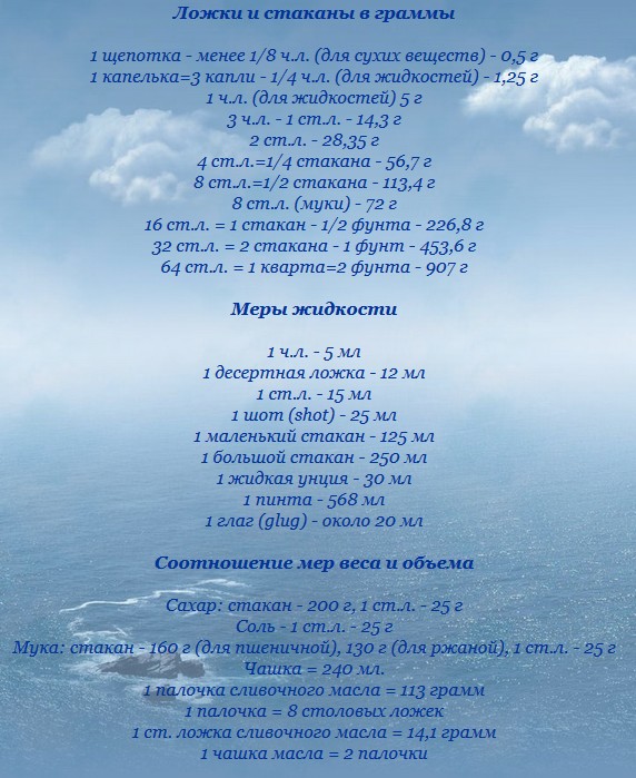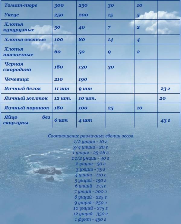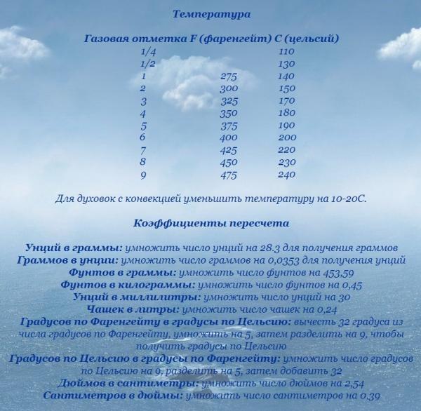 Ниже можно посмотреть таблицу мер и весов, соотношения единиц весов (унции и граммы), градусов (по цельсию и фаренгейту). А также можно узнать о том, чем заменить в рецептах алкогольные напитки и редкие экзотические продукты.
