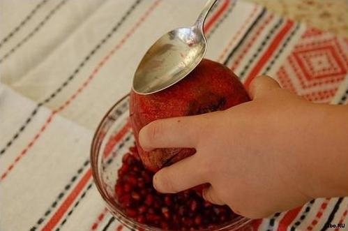 Переворачиваем гранат – срезом вниз. Берем столовую ложку и начинаем постукивать по кожуре. Постукивания уверенные и равномерные – и зерна гранатовые начнут прыгать в посудину. Не бойтесь повредить зерна. Продавец на рынке вообще ручкой ножа выбивал зерна из граната – все были целы.