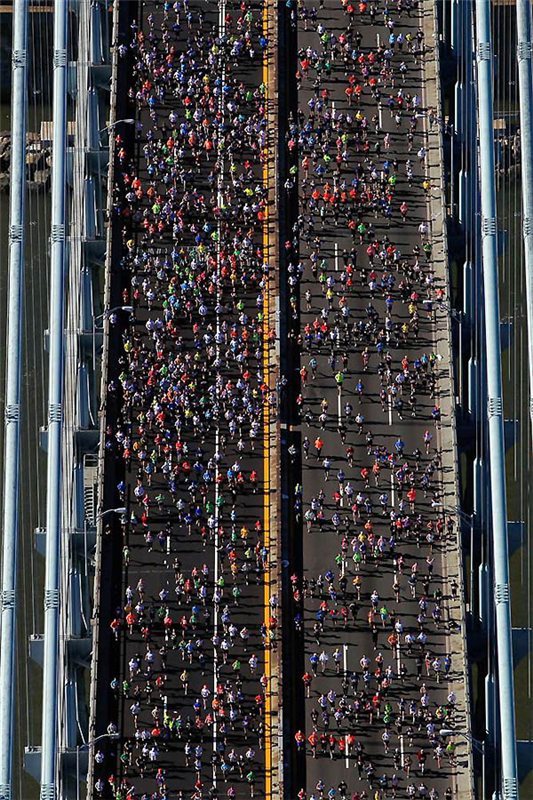 Люди занимаются зарядкой и спортом. И ни где-нибудь. А в огромном мегаполисе и это взгляд на Verrazano-Narrows Bridge — мост Верразано-Нэрроуз. Бегуны во время Нью-Йоркского марафона.