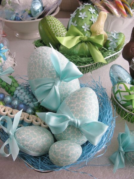 Если на вашем столе появятся динозавровые яйца, впечатления гостям гарантированы. «Сделать» их достаточно просто. Необходимо очень плотно обмотать сухие яйца кусочками марли, закрепив ее кончики резинкой, и опустить в раствор какой-нибудь краски. Лучше, если это будет естественный цвет: коричневый, благородный серый или темно-зеленый. Белые прожилки, которые останутся от марли, будут хорошо контрастировать с такими цветами и напоминать шкуру давно вымерших животных.
