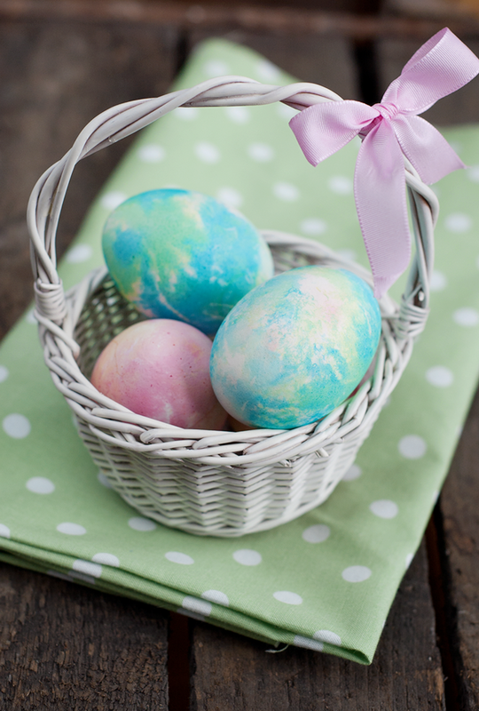 Техника мраморизации яиц удивительно проста, но эффект потрясающ. В воду с пищевой краской добавьте немного растительного масла (0,5 – 1 ст.л.) и опустите в нее уже сваренные яйца. Вода должна покрыть яйца полностью. Оставьте их на некоторое время, пока не будет получен желаемый цвет. Затем насухо вытрите скорлупу от остатков масла бумажной салфеткой и, если хотите, повторите эксперимент, но уже опустив яйца в емкость с другой краской.