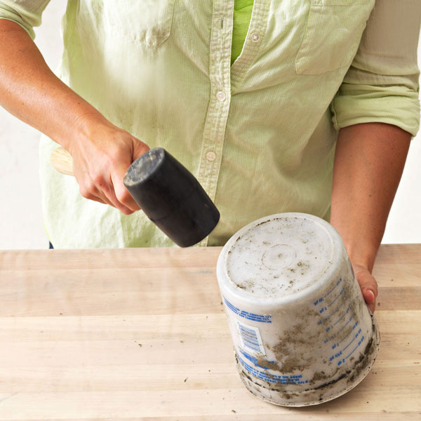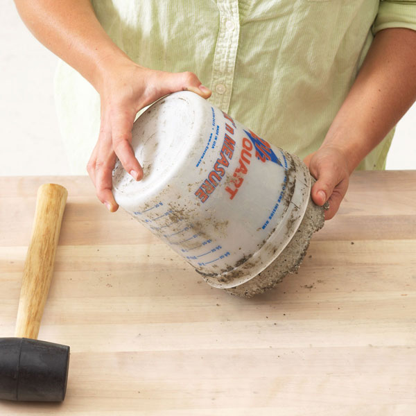 Молотком нужно постучать по внешней стороне большой ёмкости. Это делается для того, чтобы убрать пузырьки воздуха из массы.