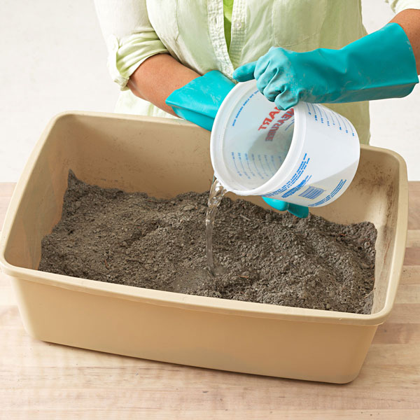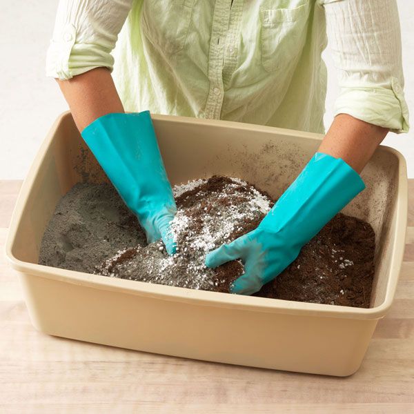 Необходимо взять в равных частя, в данном случае по одной части цемента, песка (в примере - торф, земля), вермикулита и воды