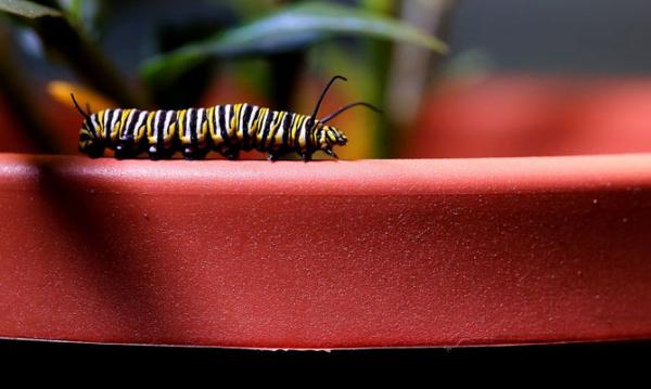 Гусеница ищет любой пригодный предмет для того, чтобы спрятаться.