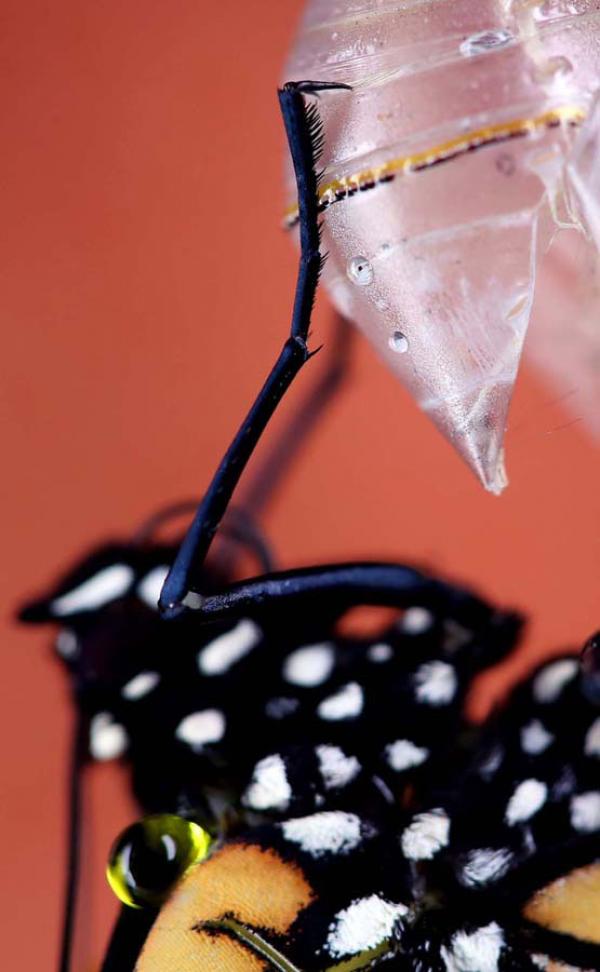После освобождения от «оков» бабочка висит несколько часов в ожидании, пока станут готовы крылья.