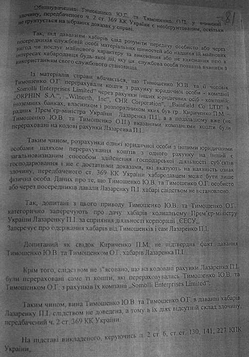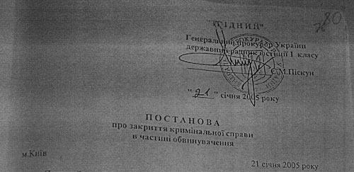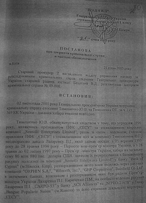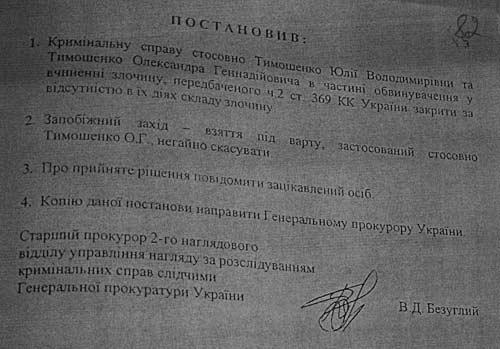 Проте, в інтернеті з'явились фотокопії постанови про закриття кримінальної справи в частині обвинувачення стосовно Тимошенко, датовані 21 січня 2005 року, тобто за декілька днів до офіційної інавгурації Президента України (23 січня) і до призначення Тимошенко прем'єр-міністром України (24 січня), кандидатура якої до того ж була під сумнівом до останнього дня, оскільки Ющенко ввагався між нею та П.Порошенком.