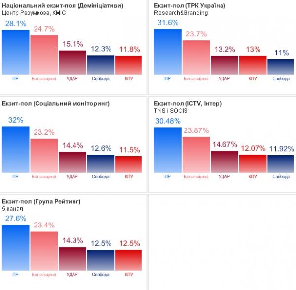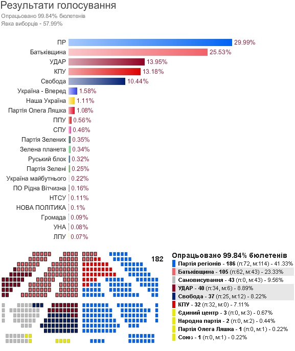 По результатам обробки 99,84% протоколів на парламентських виборах в Україні, Партія регіонів набрала 29,99% голосів, «Батьківщина» - 25,53%, «УДАР» - 13,95%, КПУ – 13,18%, «Свобода» – 10,44%