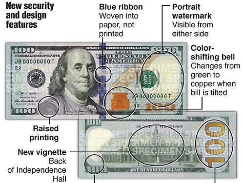 В частности, трехмерная защитная лента на лицевой стороне содержит изображение колокольчиков, которое при повороте изменяется на цифры 100. Еще одним нововведением стало появление "колокольчика в чернильнице" справа от портрета Бенджамина Франклина. Колокольчик при наклоне купюры меняет цвет с медного на зеленый. При этом он то появляется в медной чернильнице, то исчезает.