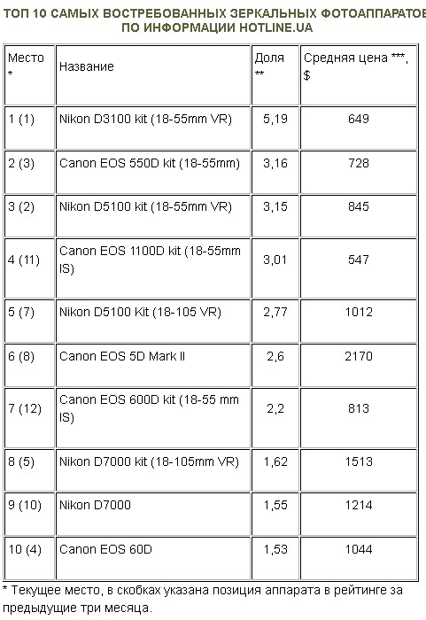 Предлагаю ознакомиться с рейтингом самых популярных зеркальных фотоаппаратов, продаваемых в Украине в IV квартале 2011 года, по данным Hotline.ua.