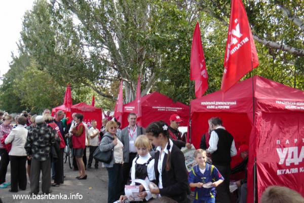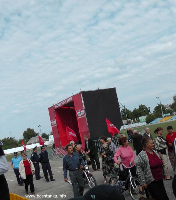 Тепер, щодо місця проведення виступу. Уже ні для кого не новина що по всій Україні, влада намагається різними способами перешкоджати спілкуванню людей з представниками різних політичних партій, окрім партії влади. До останього часу була заборона на проведення зустрічі на центральному стадіоні міста Баштанка, хоча тиждень тому... тут виступав представник Партії регіонів. Баштанці говорили, що якби не концерт в честь дня міста, то сюди окрім вчителів і держслужбовців, яких силою заганяють... ніхто б не прийшов. Люди говорять, що було соромно слухати ту маячню про "покращення життя" уже сьогодні... і про розквіт України - при повальній корупції, зростанні цін на продукти харчування та комунальні послуги, при криміналізації і узурпації влади, підвищенні пенсійного віку, знищенню середнього та малого бізнесу.