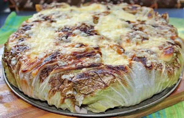 Пекинскую капусту разобрать на листы, срезать толстую часть, опустить в кипяток и сразу же вытащить на тарелку. В смазанную маслом форму положить листы. Я взяла разъемную форму для торта.Выложить половину начинки, разровнять ее. Сверху разложила половину нарезанной луковицы, хотя в фарше лук был.Закрыть фарш листиками капусты.Разложить вторую часть фарша и закрыть листами капусты.Поставить запекаться в духовку при 220 град. Запекала 20 минут, потом смазала верх сметаной и посыпала натертым сыром. Убавить до 180 и еще запекать 30 минут.