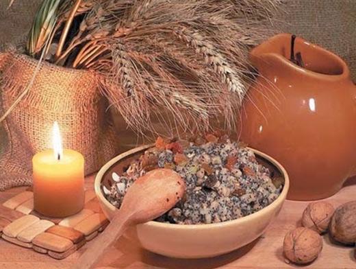 В деревянной ступке истолките 1 ст. пшеницы, подливайте понемногу теплую воду (чтобы оболочка пшеницы отошла). Массу просейте, промойте для отделения ядер от шелухи. Из зерен сварите жидкую кашу на воде, охладите и добавьте сахар (лучше мед). Разотрите 1 ст. мака (до молочка), добавьте мед и соедините с пшеницей. Затем присоедините толченые ядра грецких орехов и порубленные сухофрукты (изюм, курагу, чернослив). С этого блюда начинают трапезу.