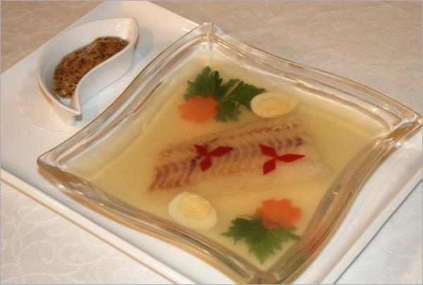 Куски филе судака припустите с добавлением кореньев, лука, лаврика. Охладите, бульон процедите. Желатин замочите в воде, распустите на водяной бане и соедините с бульоном. Филе уложите на блюдо, оформите ломтиками лимона, морковными цветочками, зеленью и залейте раствором желатина. Выдержите на холоде час.