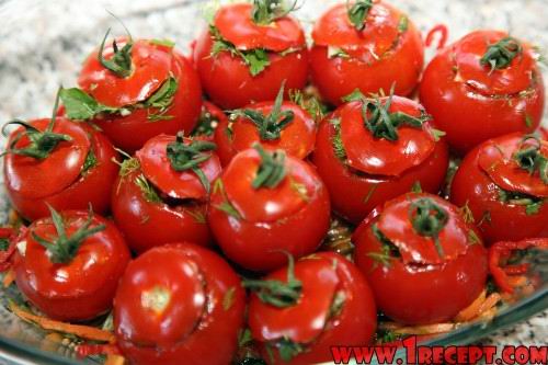 Выньте мякоть у половинок свежих помидоров. Маринованные грибы, сладкий перец, стручки фасоли и мякоть помидоров нарежьте кубиками, смешайте с кукурузой и нарезанными оливками. Заправьте салат оливковым маслом, посолите и перемешайте. Готовым салатом заполните помидоры.