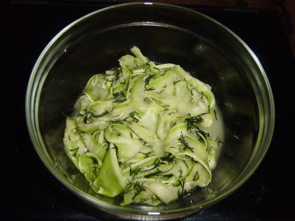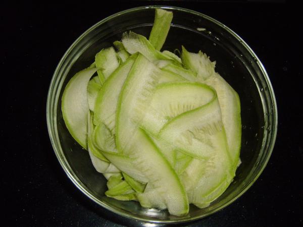 сначала нужно очистить кабачки от кожицы (я не очищала, потому что у меня молодые кабачки), а потом их нужно нарезать овощечисткой на тоненькие полоски.