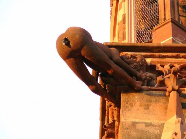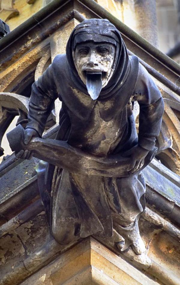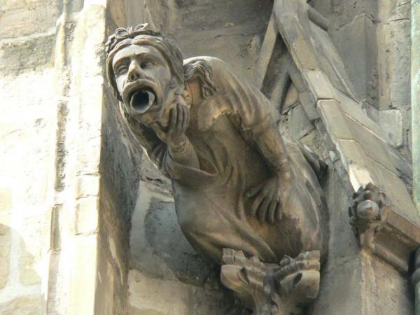 Этот страшных пример человеческой формы в изображении гаргулий также находится на соборе святого Вита в Праге. Причем, труба, по которой стекает вода, так зловеще торчит изо рта, что кажется, что это просто нечеловечески длинный язык.