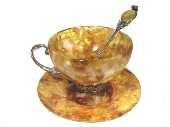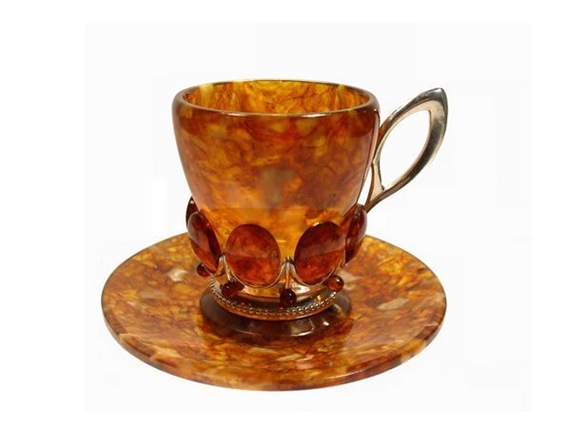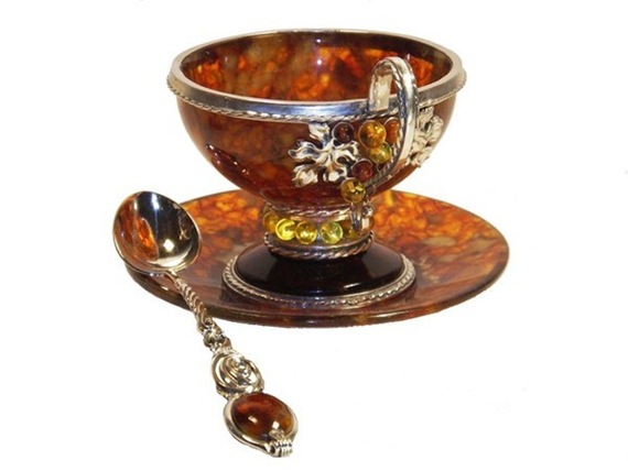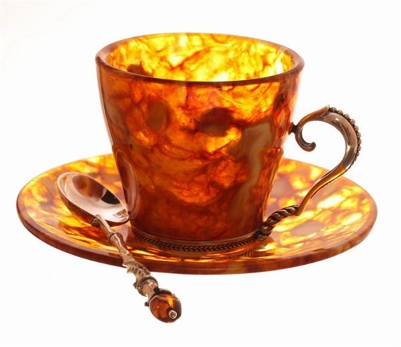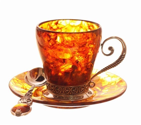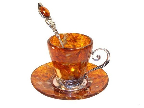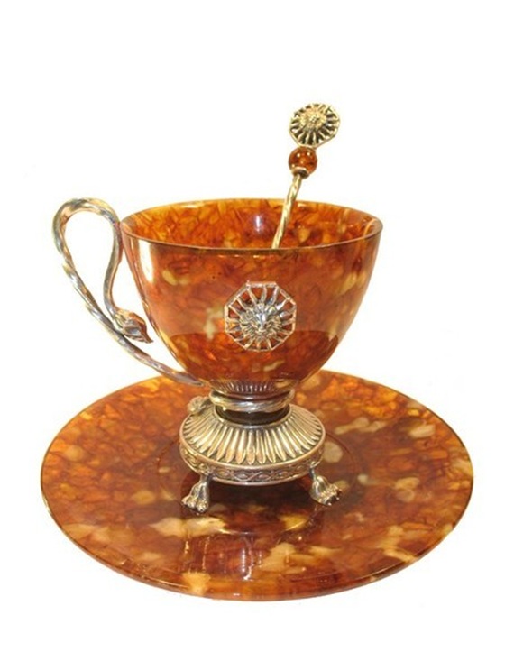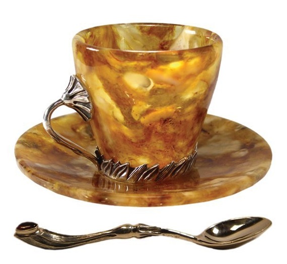 Каждую такую кофейную чашку мастер делает вручную и обрамляет янтарем и серебром.