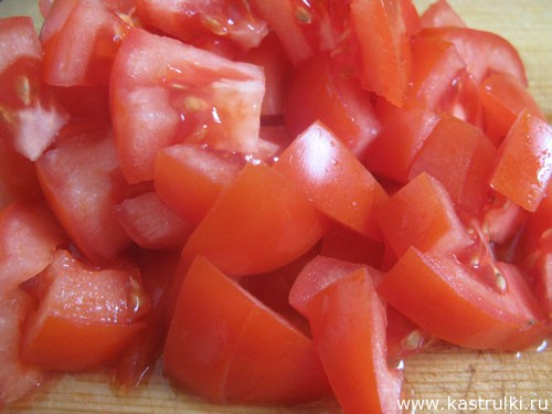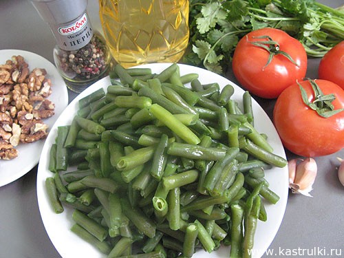 Ингредиенты: 600-700 гр. зеленой фасоли; 3 помидора; 6 зубчиков чеснока; 100 гр. грецких орехов; 50 гр. кинзы; подсолнечное масло; соль; перец.