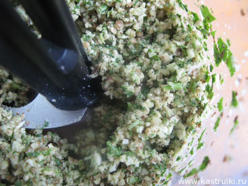 Кинзу, грецкие орехи и чеснок измельчаем блендером или пропускаем через мясорубку.