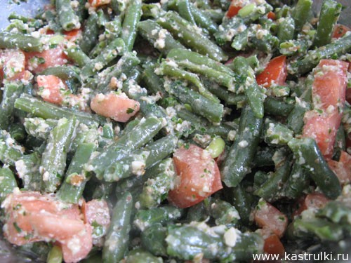 Эту смесь перемешиваем с зеленой фасолью, помидорами, заправляем маслом, солим и перчим по вкусу.