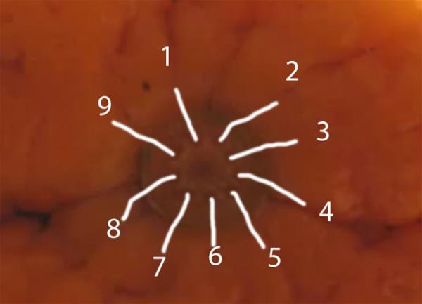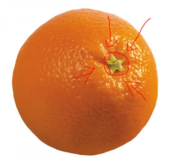2. Затем нужно посчитать количество маленьких дырочек (тех, что были под хвостиком). Это и есть количество долек в апельсине (через эти дырочки апельсин впитывает соки в свои дольки).